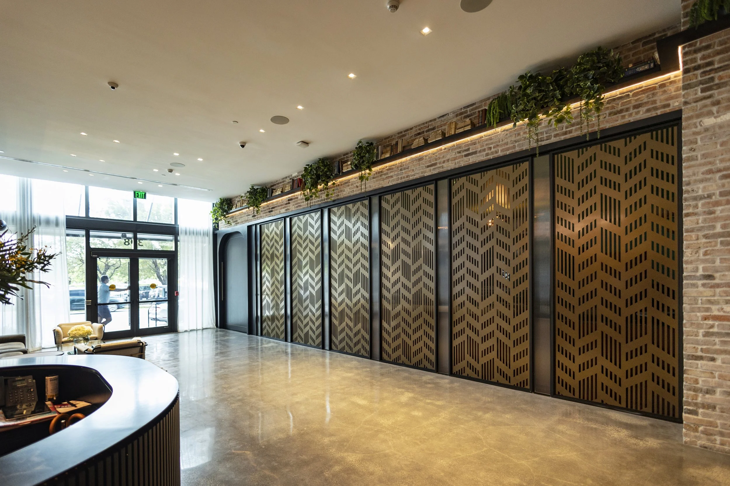 The result: a sculptural wall system that blends geometry and texture into a unified visual rhythm—adding privacy, depth, and architectural identity to the lobby without disrupting its openness or flow. The perforated panels, visible in the final installation photos, create a dynamic play between shadow and light, revealing glimpses of the interior while maintaining a sense of separation and refinement.