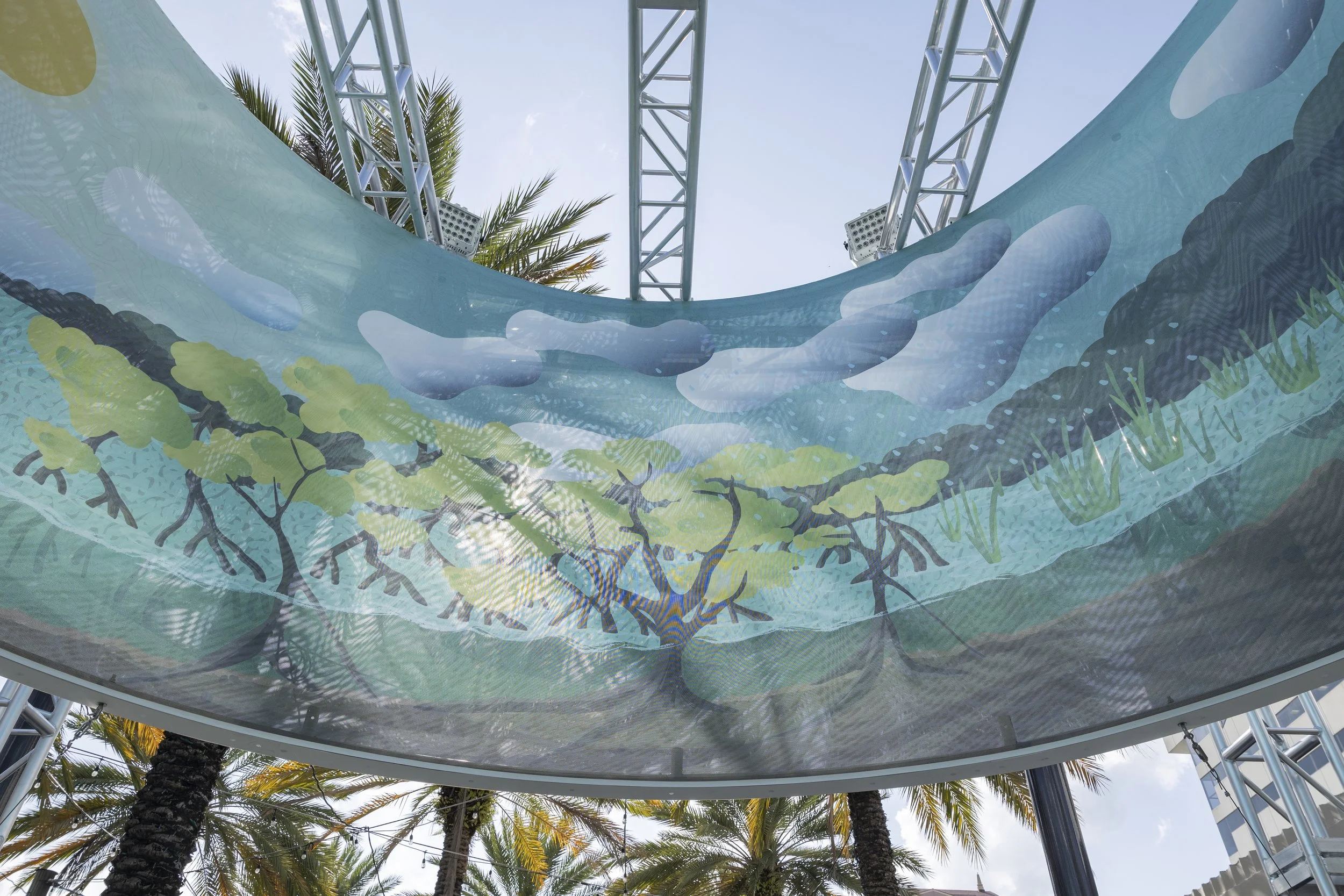 Working from the creative direction developed by Vaco Studio, Miami Design Shop was responsible for translating the concept into a durable, large-scale physical installation. Our team fabricated the elevated sculptural “well” structure that anchors the piece — engineering and building the installation to invite visitors to step inside and explore the story of Florida’s underground water movement. The structure was designed to act as both a visual landmark and an interactive learning environment within one of the city’s busiest pedestrian corridors.